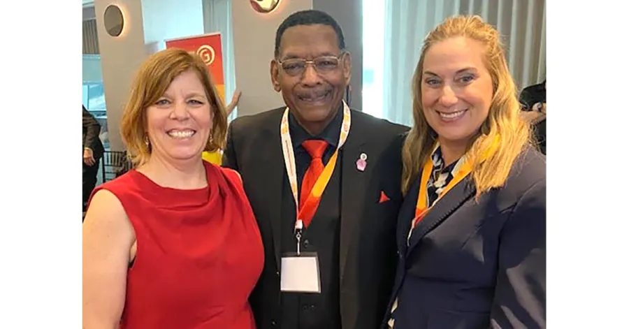 CWA President Claude Cummings Jr. (center) provided the keynote address at the Biennial Convention of CWA Local 30213, the Canadian Media Guild (CMG). CMG President Annick Forest (left) hosted the event. She, President Cummings, and CWA-SCA Canada President Carmel Smyth (right) celebrated the significant victory of CMG's National Campaign. This campaign solidified the future of CMG members who work for the Canadian public broadcaster, by obtaining a promise from the new government to increase its financing.