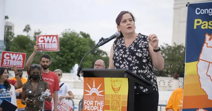 CWA Secretary-Treasurer Sara Steffens addressed the crowd at a rally yesterday in support of the For the People Act.