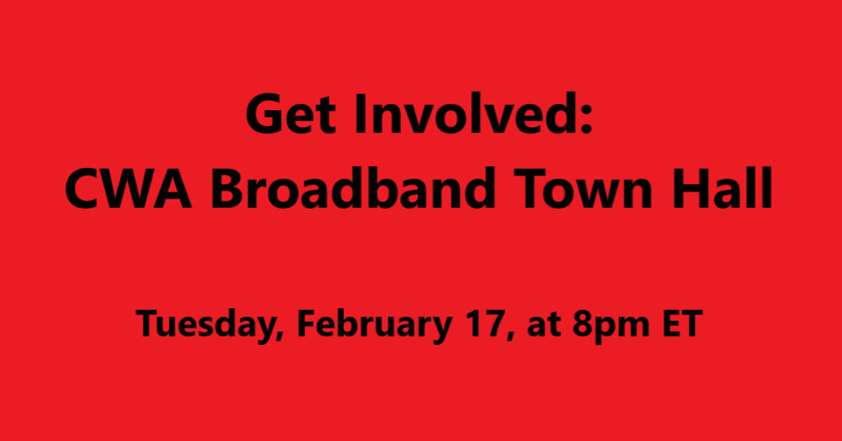 Join CWA President Claude Cummings Jr. for a virtual town hall on Tuesday, February 17, at 8pm ET to discuss the importance of state and federal oversight of broadband and how CWAers across the country can fight for a reliable and resilient telecommunications infrastructure.